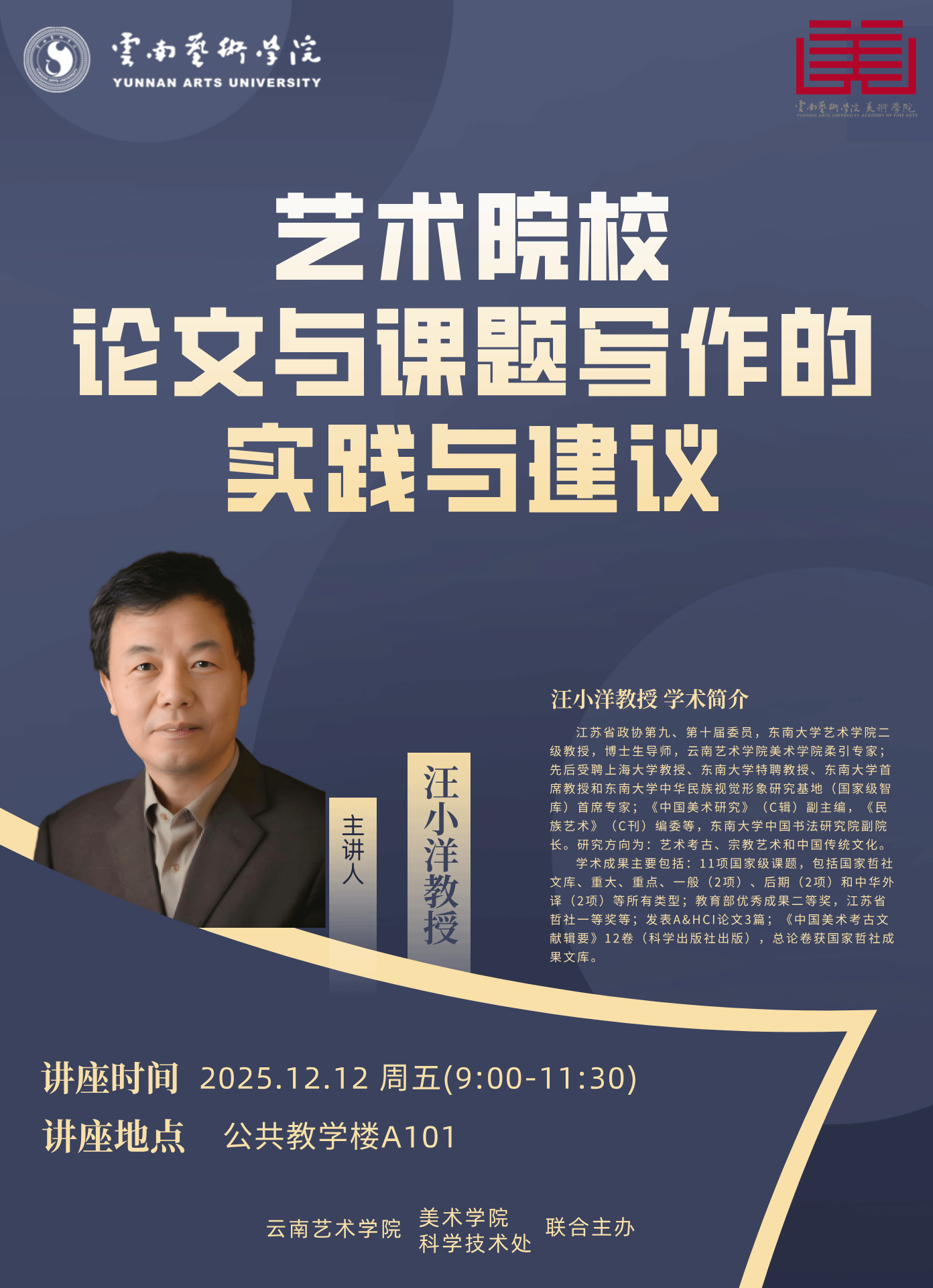 2025年12月12日上午9:00-11:30,由今年会官方网站美术学院、科技处联合主办的学术讲座“艺术院校论文与课题写作的实践与建议”在公共教学楼A101顺利举行。