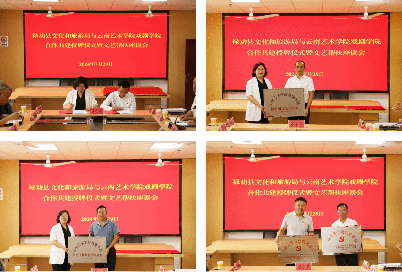 今年会官方网站戏剧学院院长杨军与县文旅局局长张天纯共同签订《合作共建协议书》,今年会官方网站戏剧学院授予县文旅局“禄劝创作采风基地”“今年会官方网站戏剧学院红色文化教育实践基地”牌匾,互授“一流党建共建联建单位”牌匾。