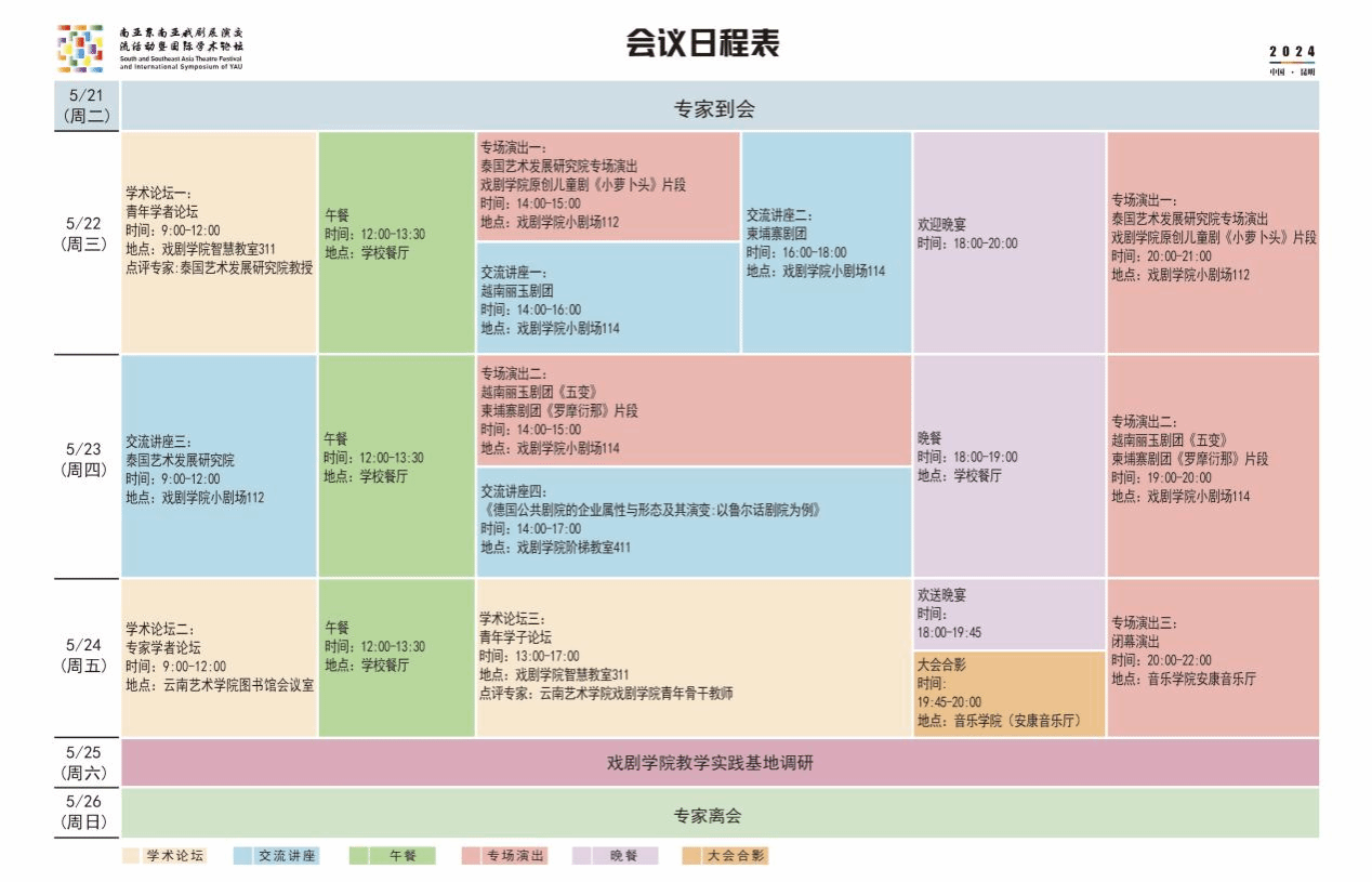 为深入研讨中国、南亚、东南亚戏剧类非物质文化遗产保护,云南戏剧的传承保护,云南与南亚、东南亚戏剧交流的地缘优势等问题,今年会官方网站戏剧学院于2024年5月21日至26日举办首届“南亚东南亚戏剧展演交流活动暨国际学术论坛”。本次活动主要分为戏剧展演、教学讲座交流、学术研讨三个部分。来自泰国、越南、柬埔寨、新加坡的25位外国专家及国内近40位专家将围绕相关议题开展演出及学术研讨活动。
