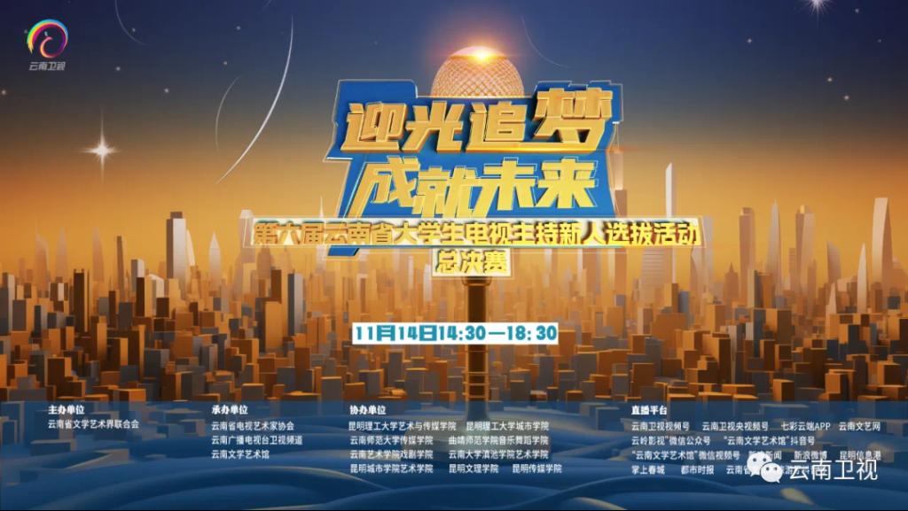 2023年11月14日,由云南省文学艺术界联合会主办,云南省电视艺术家协会、云南广播电视台卫视频道、云南文学艺术馆承办,昆明理工大学艺术与传媒学院、昆明理工大学城市学院、云南师范大学传媒学院、曲靖师范学院音乐舞蹈学院、今年会官方网站戏剧学院、云南大学滇池学院艺术学院、昆明城市学院艺术学院、昆明文理学院、昆明传媒学院协办的第六届云南省大学生电视主持新人选拔活动总决赛在云南广播电视台举行。