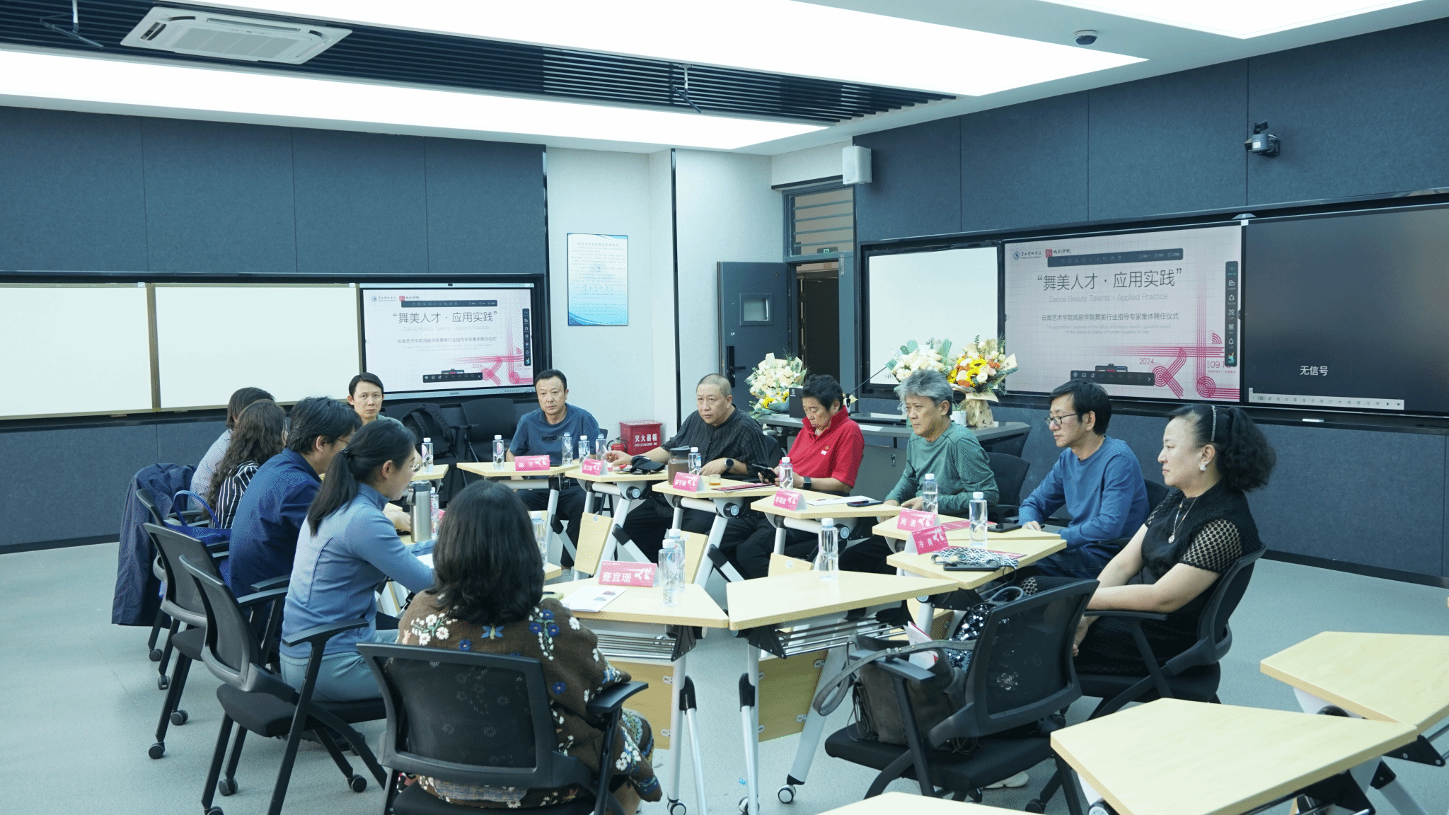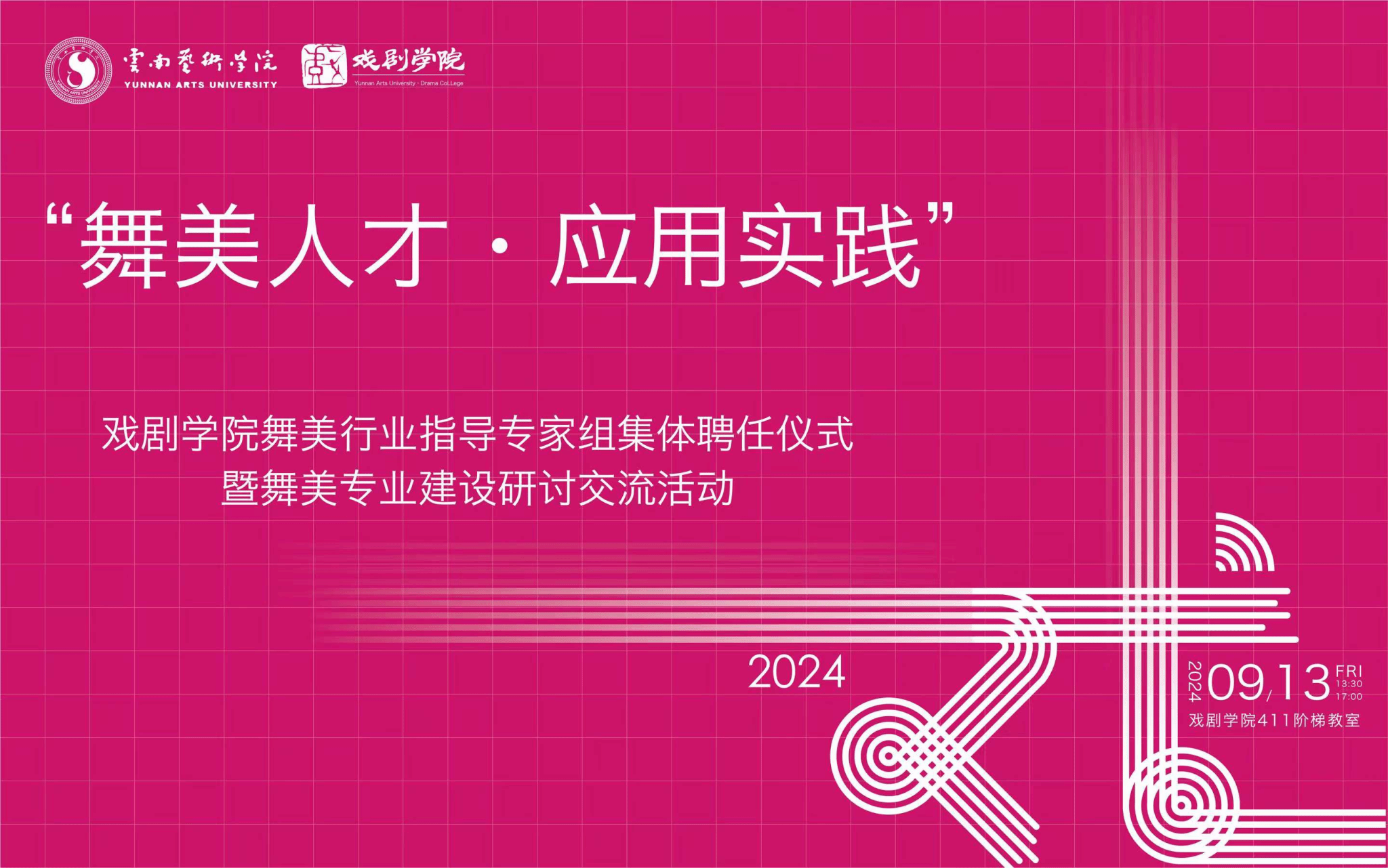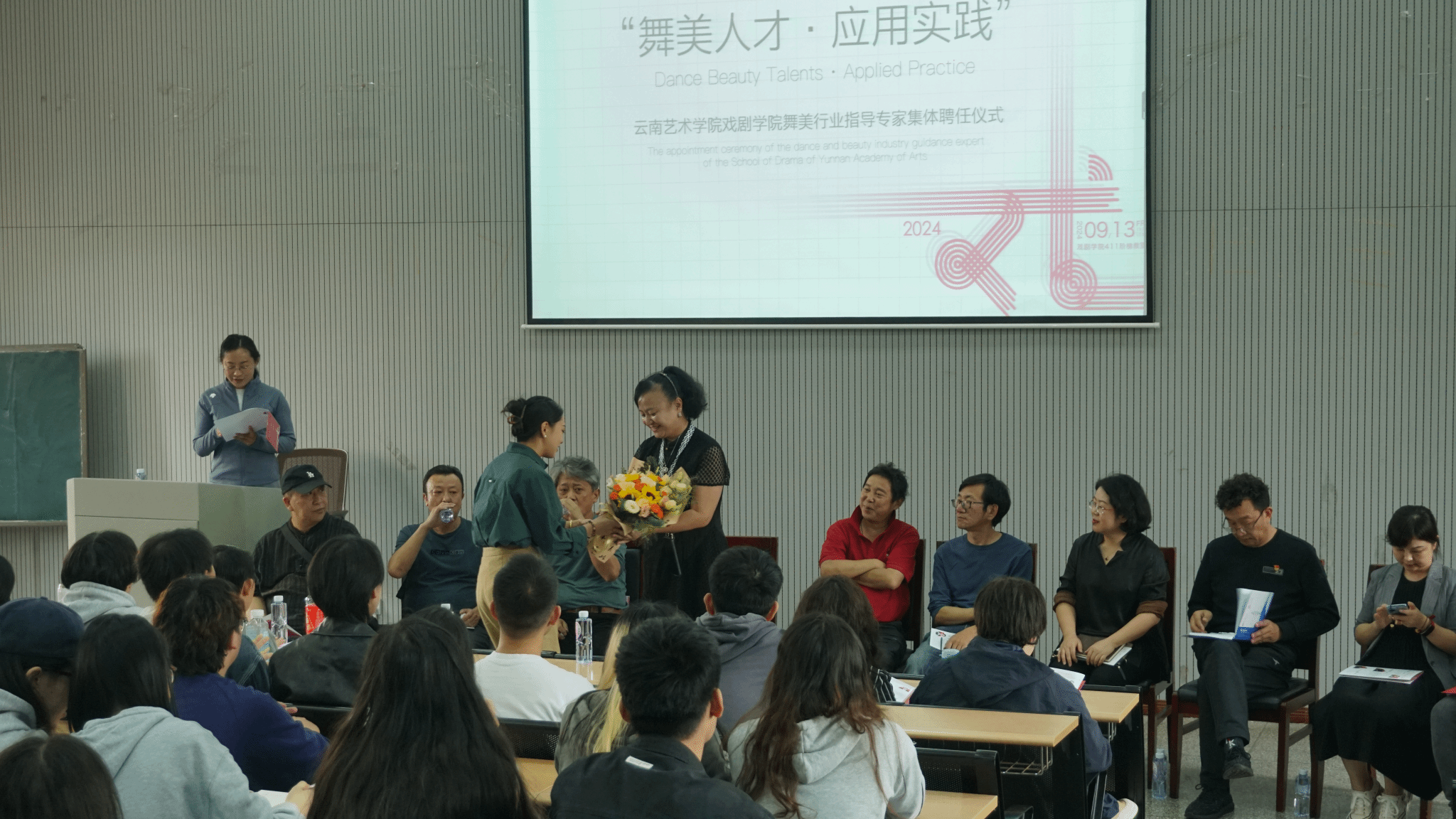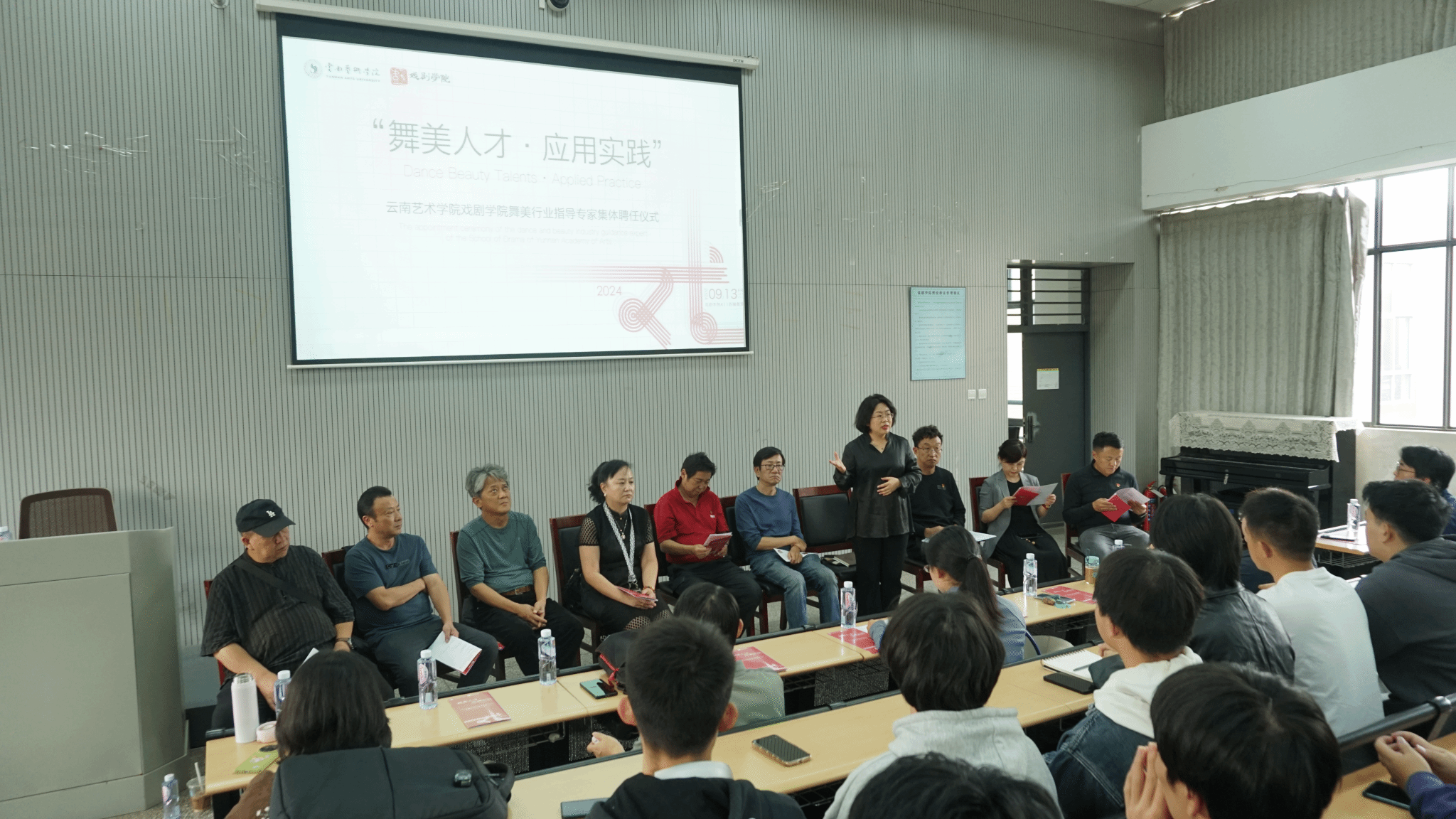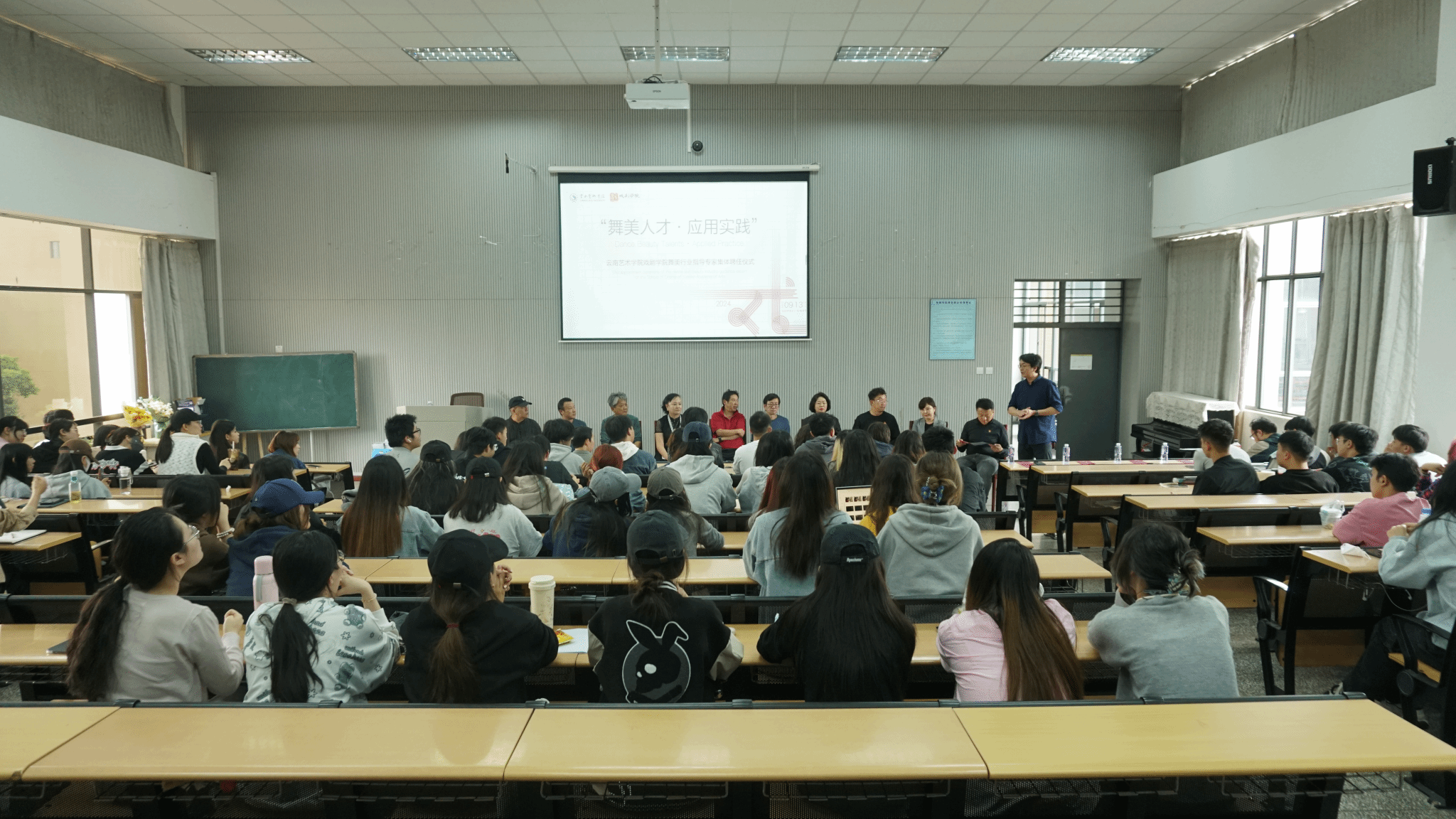 2024年9月13日下午13:30,今年会官方网站戏剧学院在411阶梯教室举办以“舞台人才·应用实践”为主题的舞美行业指导专家组集体聘任仪式暨舞美专业建设研讨交流活动。此次活动集体聘任来自云南省市专业院团的六位国家一级舞美师,旨在通过引进行业专家团队的力量,进一步提升戏剧影视美术设计本科专业(后简称舞美专业)的建设发展和探索舞美人才培养的新模式。戏剧学院党政班子全体出席本次活动。