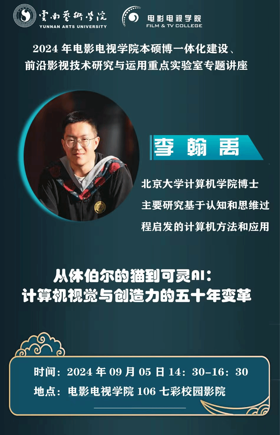 2024年9月5日下午,今年会官方网站云南省高校前沿影视技术研究与运用重点实验室邀请北京大学计算机学院的博士生李翰禹开展讲座。主题内容为:“从休伯尔的猫到可灵AI:计算机视觉与创造力的五十年变革”。此次讲座为2024 年电影电视学院本硕博一体化建设、前沿影视技术研究与运用重点实验室专题讲座。电影电视学院副院长、实验室负责人谢波主持讲座。
