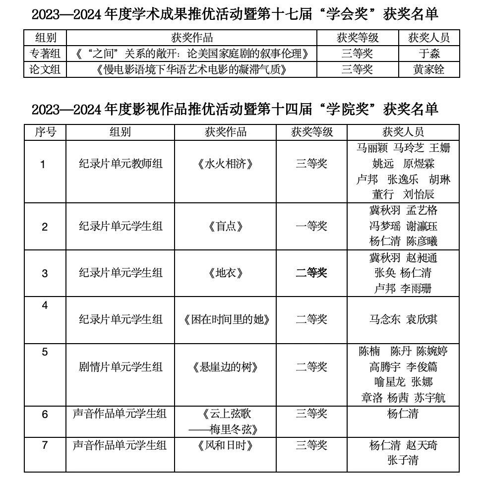 电影电视学院师生共有9件作品获奖,分别为:学术专著及论文组别奖项2项;纪录片单元获奖作品教师组1项,学生组3项;剧情片单元获奖作品1项;声音作品单元学生组获奖2项。优秀成绩的取得不仅是对电影电视学院师生学术研究和创作能力的认可,也是对电影电视学院影视艺术教育教学地充分肯定。