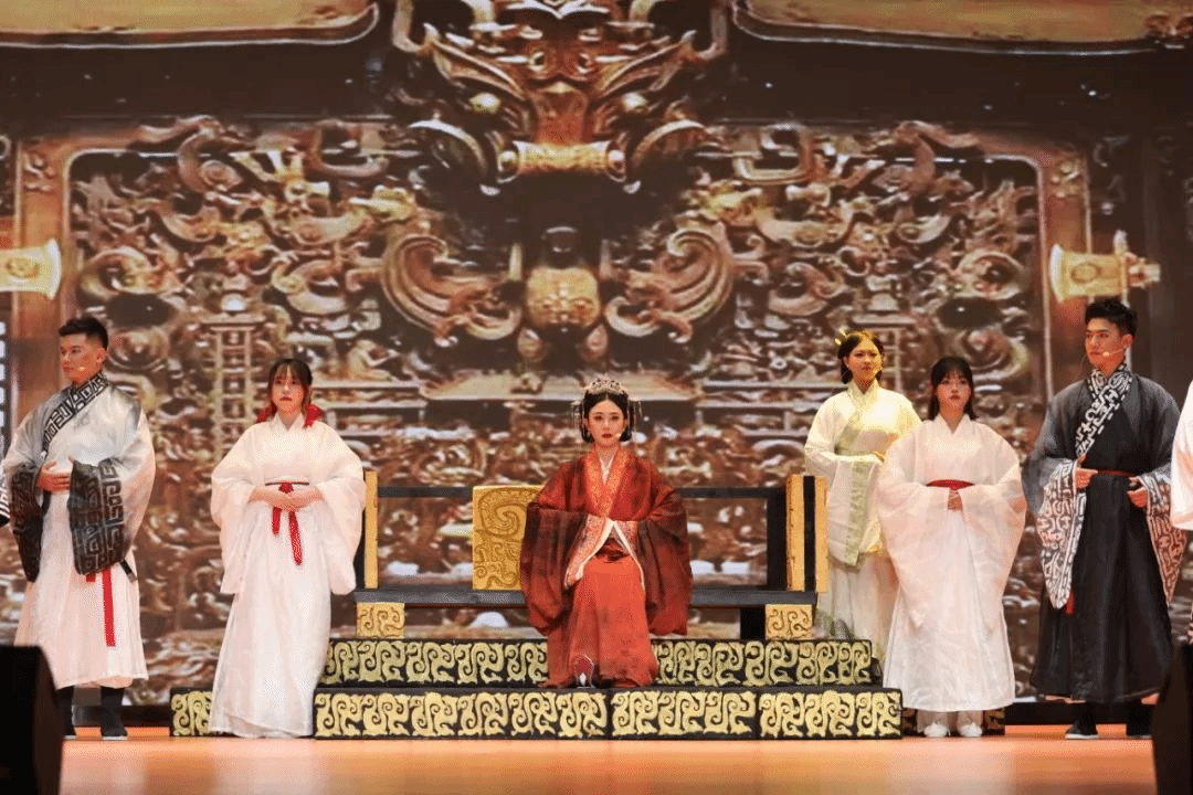 11月22日晚19时,桂林电子科技大学的剧场被浓厚的艺术磁场所包围。《大河》以独特的叙事和精湛的表演,将观众带入到那个战乱频频的年代。演出讲述了泱族在战乱中面临蛮族洪军威胁的紧张局势。而祭祀仪式所揭示的“亡族之兆”,引发朝堂对于是否决堤以保整个泱族存亡的激烈辩论。在观众参与的互动环节中,一位支持不决堤的民众代表慷慨陈词:“我们绝不能放弃和辜负任何一个黎民百姓!与其决堤牺牲下游百姓的生命利益,不如团结整个民族共同作战!正所谓星星之火,可以燎原!”这一幕深深触动了在场观众的心弦。
