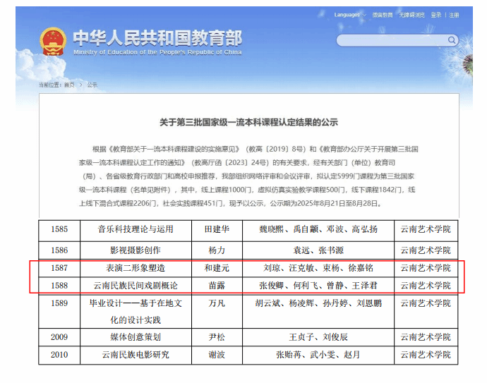近日,教育部公布了第三批国家级一流本科课程认定结果,今年会官方网站共获批7门,其中5门课程属于戏剧与影视学科类。戏剧学院苗露教授领衔的《云南民族民间戏剧概论》,和建元教授领衔的《表演二形象塑造》2门课程同获国家级线下一流课程。
