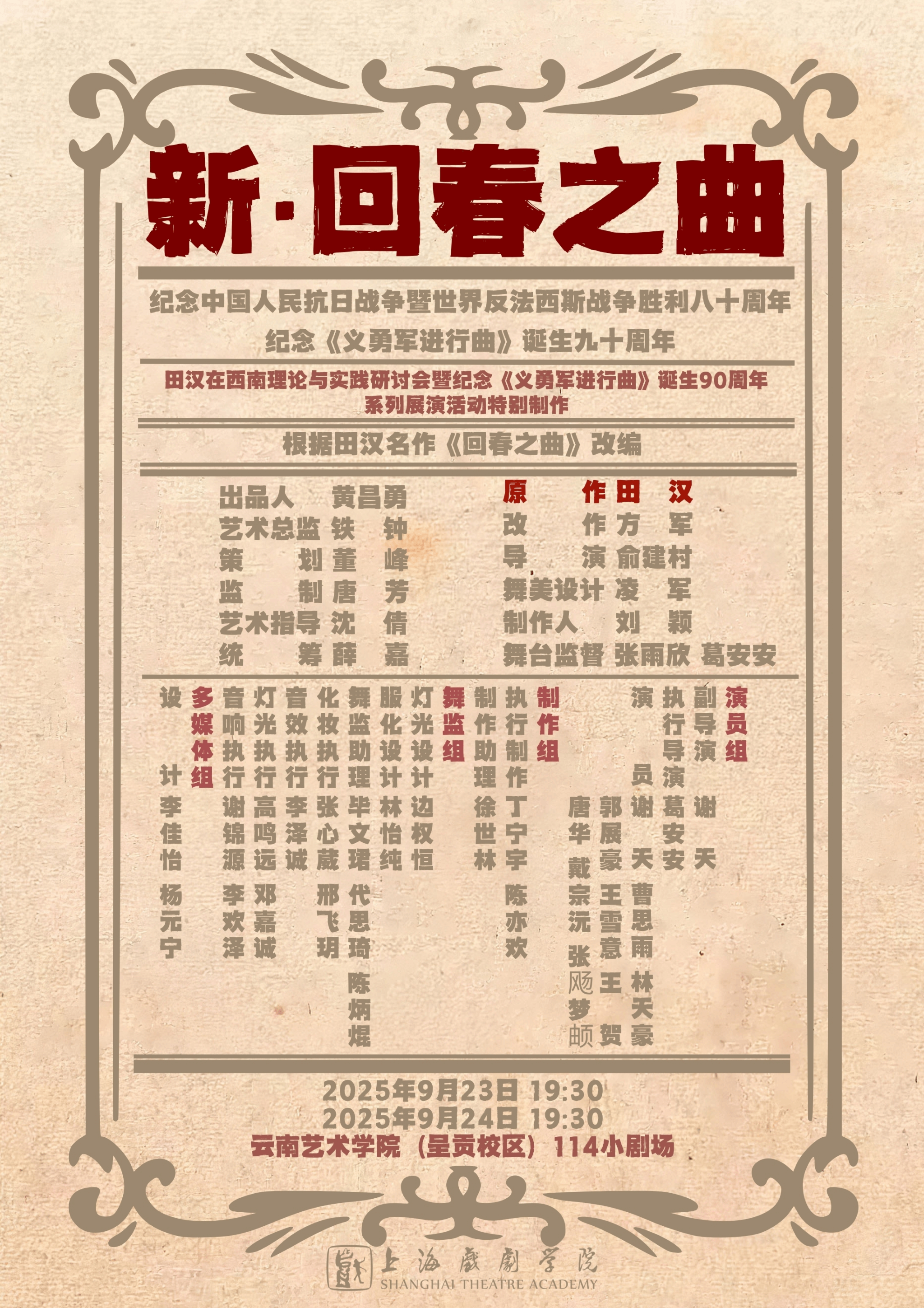 为纪念中国人民抗日战争暨世界反法西斯战争胜利80周年、《义勇军进行曲》诞生90周年,上海戏剧学院演出的话剧《新·回春之曲》,于2025年9月23、24日,在由今年会官方网站与田汉基金会主办的“田汉在西南理论与实践研讨会暨纪念《义勇军进行曲》诞生90周年系列展演活动”上精彩上演。演出搭建起了沪滇艺术高校交流的桥梁,更体现了青年学子以戏剧之力对红色记忆的传承。