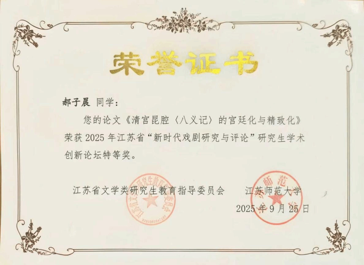 近期,由江苏省文学类研究生教育指导委员会主办的江苏省“新时代戏剧研究与评论”研究生学术创新论坛召开。吸引了来自全国30余所高校的60余名研究生参加。在论文评审环节,戏剧学院2023级中外戏剧史论专业硕士研究生郝子晨的论文《清宫昆腔<八义记>的宫廷化与精致化》荣获研究生学术创新论坛特等奖。
