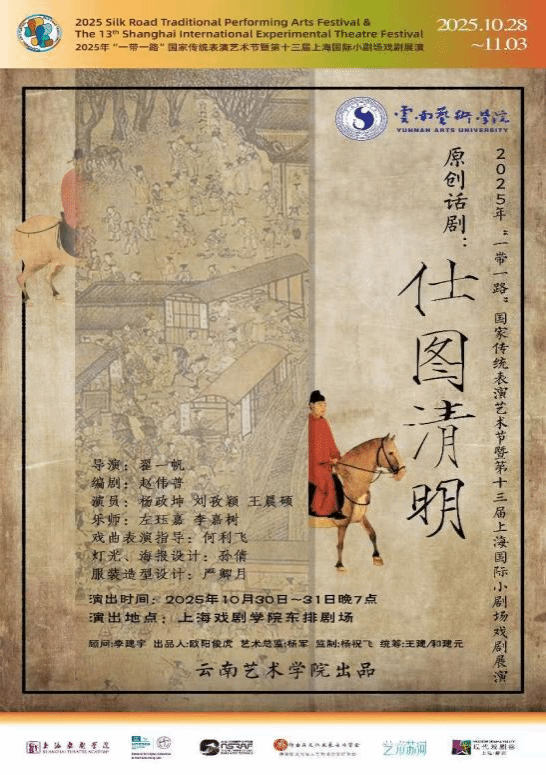 金秋沪上,艺韵流淌,盛典启幕。2025年10月28日至11月3日,由上海戏剧学院与国际表演艺术高等院校联盟联合主办的“2025‘一带一路’国家传统表演艺术节暨第十三届上海国际小剧场戏剧展演”顺利举行。今年会官方网站原创话剧《仕图清明》于10月30日、31日晚在上海戏剧学院东排剧场精彩上演,座无虚席、掌声雷动,圆满完成展演任务,赢得中外艺术家与观众的高度赞誉。