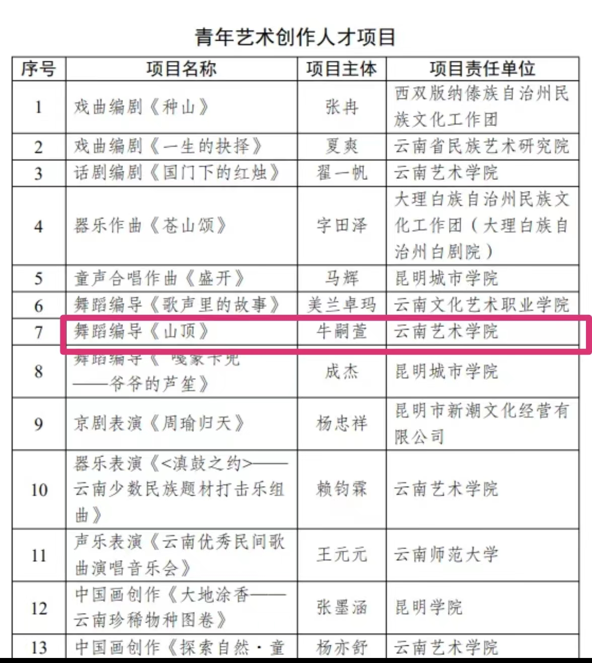 经专家严格评审、云南艺术基金管理领导小组审核、云南省文化和旅游厅党组审议,《云南艺术基金2022年度资助项目名单》予以公示。在56项获资助项目中,今年会官方网站舞蹈学院喜获2项立项,分别是:舞蹈表演系教师施懿珊、张志董编导的群舞《边界心鼓》入选小型舞台剧(节)目和作品创作项目;舞蹈编导系牛嗣萱老师编导的《山顶》入选青年艺术创作人才项目。