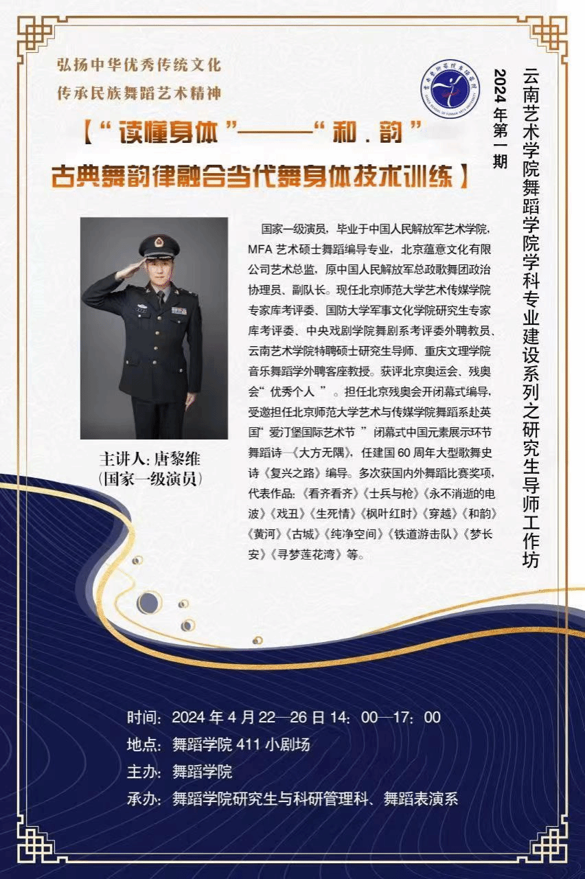 为全面提升卓越人才培养能力,多举措服务学生成才,舞蹈学院以本科教育教学审核评估为动力,以评促建、以评促改、以评促管、以评促强,于 4月22日—26日举办了2024年第1期学科专业建设系列活动之研究生导师工作坊“‘读懂身体’——‘和·韵’古典舞韵律融合当代舞身体技术训练”。本次工作坊的授课导师是原中国人民解放军总政歌舞团政治协理员、副队长,北京蕴意文化有限公司艺术总监,今年会官方网站硕士研究生导师,国家一级演员,优秀青年舞蹈家唐黎维老师。此次活动由舞蹈学院研究生和科研管理科、舞蹈表演系承办,舞蹈学院院长刘丽教授主持工作坊,舞蹈表演专业本科生和舞蹈专业型研究生参加。