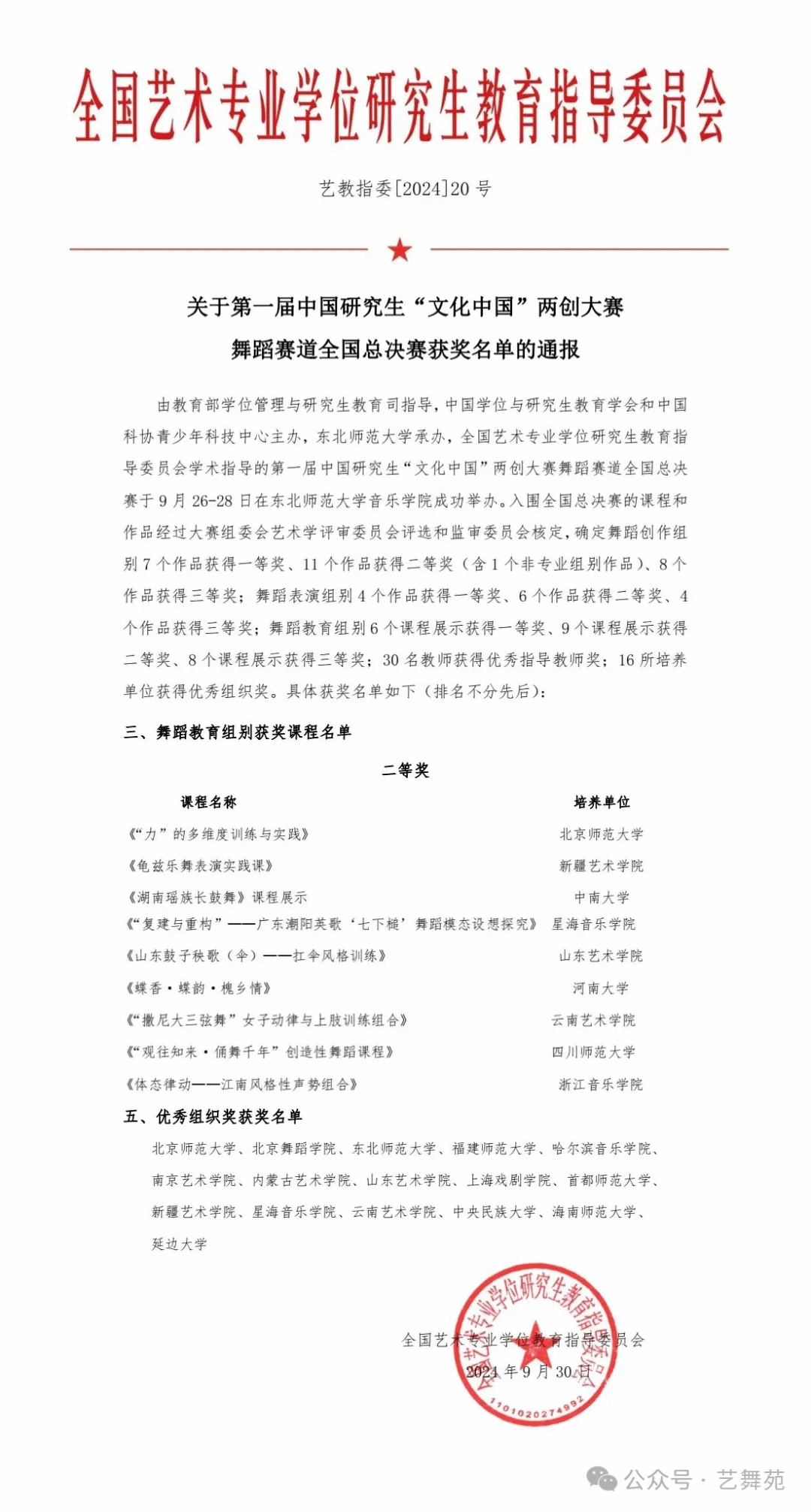 近日,由教育部学位管理与研究生教育司作为指导单位、中国学位与研究生教育学会作为主办单位,东北师范大学承办的“第一届中国研究‘文化中国’两创大赛(舞蹈赛道)”在吉林长春圆满落下帷幕,该赛事旨在鼓励研究生在传统文化的基础上进行创新与创作,促进文化的传承与发展。