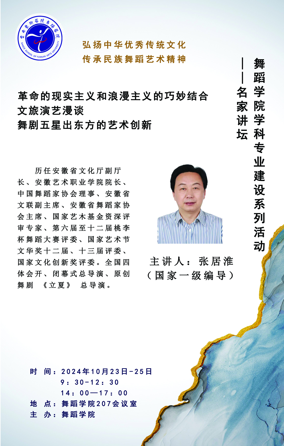 2024年10月23—25日,舞蹈学院于207会议室举办学科专业建设系列活动之“名家讲坛”。本次活动特邀原安徽省文化厅副厅长、原安徽艺术职业学院院长、国家艺术基金资深评审专家、国家一级导演张居淮进行了题为《革命现实主义和浪漫主义的巧妙结合》《文旅演艺漫谈》《舞剧<五星出东方>的艺术创新》的学术讲座。舞蹈学院全体研究生参加学习。