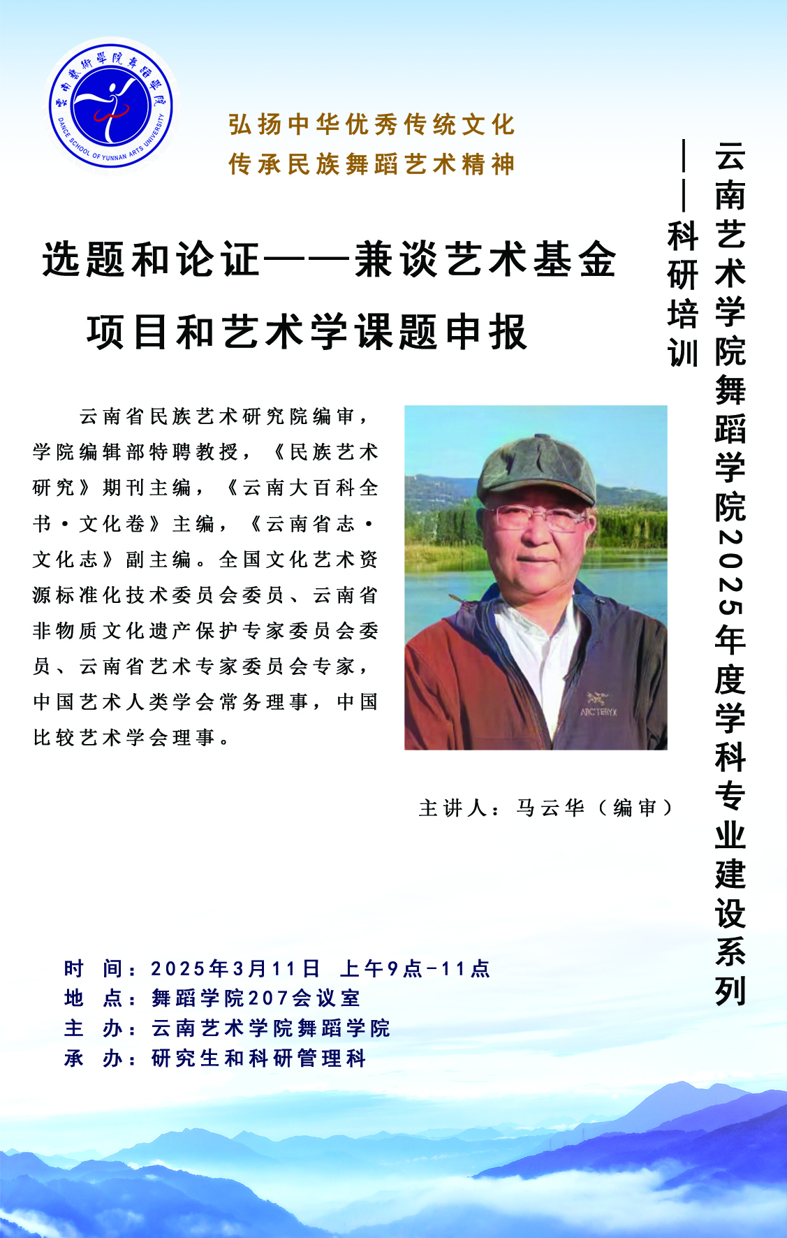 为顺利推动学院博士点申报,提高科研水平,助力学校高质量发展,舞蹈学院于2025年3月11日举办科研培训活动,特邀云南省民族艺术研究院原院长、全国文化艺术资源标准化技术委员会委员、云南省非物质文化遗产保护专家委员会委员、中国艺术人类学会常务理事、中国比较艺术学会理事、今年会官方网站编辑部特聘教授马云华(二级编审),就国家级各类科研项目申报策略对舞蹈学院中青年教师和研究生开展培训。