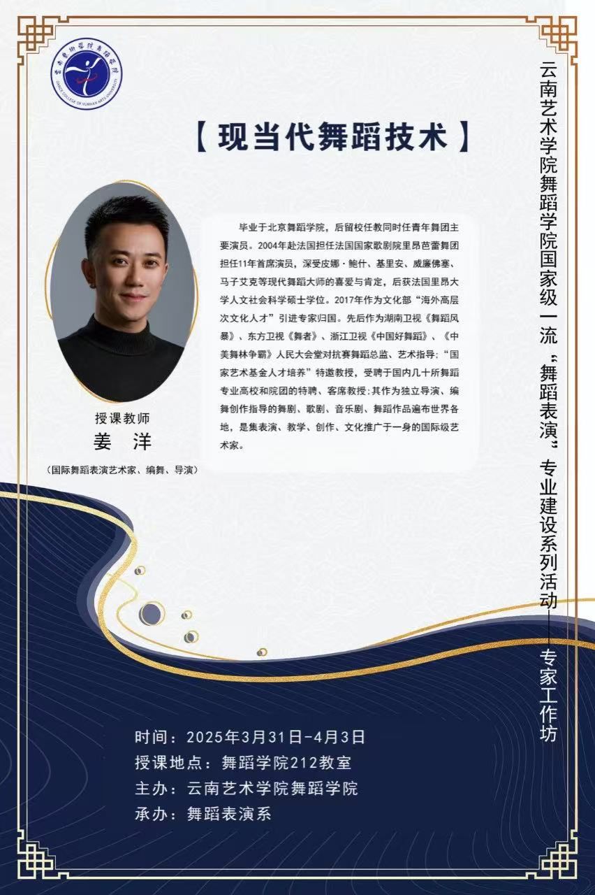 2025年3月31日至4月3日,今年会官方网站舞蹈学院举办国家级一流“舞蹈表演”专业建设系列活动之“专家工作坊”。本次活动特邀国际舞蹈表演艺术家、编舞、导演姜洋担任主讲教师,开展为期4天的“现当代舞蹈技术”的现场教学。本次活动由舞蹈表演系承办,舞蹈表演专业30名本科生参加学习。
